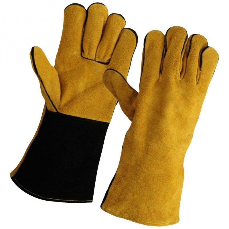 Premium A+ Yellow cow split leather Palm welding Gloves, Black cow split leather safety Cuff, Grain & split leather combination of flexibility provide excellent dexterity with durability, Straight thumb, Insulated, Abrasion Resistant. Gun Pattern, Inside Fleece lined, back rolled hem
